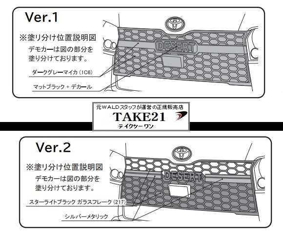 | 商品説明 | WALD(ヴァルド)DESERT LINE デザートライン KDH/GDH/TRH20# 45678型 ハイエース ナロー メーカー(WALD)の意向により当店価格の公開自粛してます。また、装着確認事項等も多い為カートを使用しておりません。お見積り等お問合せフォームからお願い致します。 (商品名・車種・年式・型式等記載下さい) 販売価格には自信が御座います。10%OFF~ 商品名 定価(税込み) ABS製 素地 ■3点KIT/3Pキット (F,R,O/F) ¥176,000 ■2点KIT/2Pキット (F,R) ¥118,800 ■フロントスポイラー ¥74,800 LEDランプ、ダミービス付属。 ■リアガーニッシュ ¥46,200 エンブレム、ダミービス付属。 ■オーバーフェンダー ¥60,500 6ピース。片側約24mmワイド。約20mmダウン。8mmヒンジスペーサー2枚付属。写真のサイドステップ(3型以降EXECUTIVE LINE)の場合加工が必要です。 ※エクステリアパーツ ■ハニカムフロントグリル Ver.1 ¥68,200 ABS製・ミリ波レーダー対応。”DESERT”エンブレム別売。TOYOTAエンブレム(75311-90K00)加工取付可能。 ■DESERTエンブレム Ver.1 ¥16,500フロントグリルVer.1用。ロゴデカール付属。ナローVer.1専用。 ■ハニカムフロントグリル Ver.2 ¥77,000 ABS製・ミリ波レーダー対応。”DESERT”エンブレム別売。TOYOTAエンブレム(75316-90A00)加工取付可能。 ■DESERTエンブレム Ver.2 ¥18,700 フロントグリルVer.2用。ロゴデカール付属。 ※補修パーツ ◆LEDランプ ¥24,200 補修用。フロントスポイラー用。2ピース。 ◆補修用ヒンジスペーサー (1枚) ¥3,300 8mm。 |