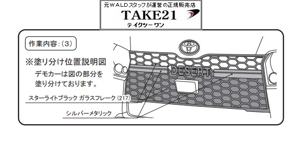 | 商品説明 | WALD(ヴァルド)DESERT LINE デザートライン KDH/GDH/TRH 21#/22# 45678型 ハイエース ワイド/スーパーロング メーカー(WALD)の意向により当店価格の公開自粛してます。また、装着確認事項等も多い為カートを使用しておりません。お見積り等お問合せフォームからお願い致します。 (商品名・車種・年式・型式等記載下さい) 販売価格には自信が御座います。10%OFF~ 商品名 定価(税込み) ABS製 素地 ■3点KIT/3Pキット (F,R,O/F) ¥198,000 ■2点KIT/2Pキット (F,R) ¥140,800 ■フロントスポイラー ¥83,600 ダミービス付属。LEDランプ2ピース付属(2ピースオプション)ダミービス/LEDカバー付属。 ■リアスカート ¥59,400 エンブレム付属。ダミービス付属。 ■オーバーフェンダー ¥60,500 6ピース。片側約24mmワイド。約20mmダウン。8mmヒンジスペーサー2枚付属。 ※エクステリアパーツ ■ハニカムフロントグリル ¥80,300 ミリ波レーダー対応。”DESERT”エンブレム別売。TOYOTAエンブレム(75316-90A00)加工取付可能。 ■DESERT エンブレム ¥18,700 ワイドフロントグリル用。ロゴデカール付属。 ■LEDランプ ¥24,200 オプション/補修用。2ピース。フロントスポイラー用。 ※補修パーツ 補修用ヒンジスペーサー (1枚) ¥3,300 8mm。 |
